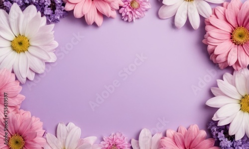 Obraz premium Top view flatlay romantic flowers pink and white color with space for text in the middle at purple background. Birthday, Happy Women's Day, Mother's Day concept.