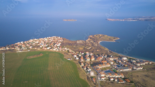 © Mariia Human, Obraz premium Top view from a drone on a small town with houses, among the field and on the horizon a clear blue sky and sea