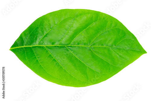 © Sathaporn, Obraz premium Top view green Avocado leaf on isolated white background ,Top view green leaf on isolated white background