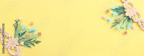 Obraz premium Top view image of autumn forest natural composition over yellow background...