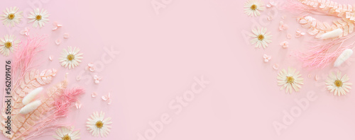 © tomertu, Fototapeta premium Top view image of pink dry flowers over pastel background .Flat lay