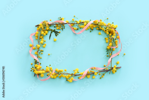 Fototapeta premium Top view image of spring yellow mimosa flowers composition over pastel blue background