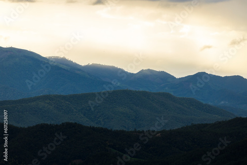 Fototapeta premium Top view Landscape of Morning Mist with Mountain Layer at north of Thailand. mountain ridge and clouds in rural jungle bush forest