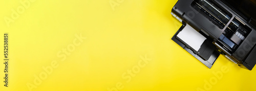 © GRON777, Obraz premium Top view, layout, banner on photo printer and blank sheet of photo paper on yellow background