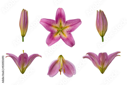 © No background, Naklejka premium Top-view macro pink lily bloom isolated, no background