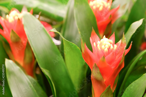 Fototapeta premium Top view of a beautiful pink petal of green leaves flowers on a background of large green leaves.