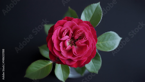 © Al, Fototapeta premium Top view of a blooming red rose placed diagonally with visible leaves, featuring dramatic yet natural contrast on a pure black canvas