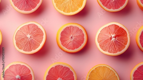 Fototapeta premium Top view of a colorful pattern with sliced citrus fruits on a pink background
