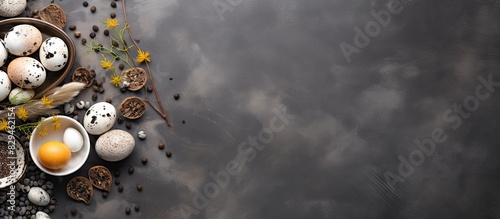 © Gular, Fototapeta premium Top view of a grey table with a plate full of peeled hard boiled quail eggs Ideal for adding text as a copy space image