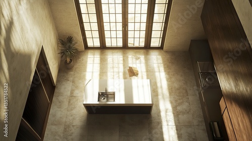 © THUA, Obraz premium Top view of a modern kitchen featuring a pristine empty table central layout open and minimal design natural tones and bright light fill the space.