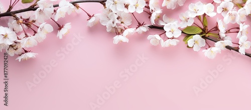 Obraz premium Top view of a spring-themed pastel pink background adorned with delicate white flowering branches, ideal for a springtime concept, with ample copy space image.