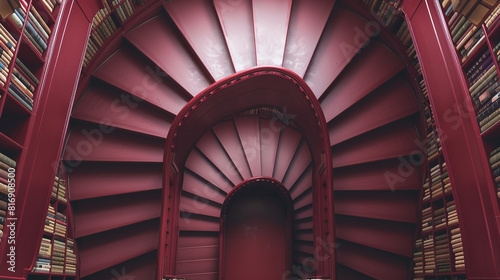 Fototapeta premium Top view of a three-quarter turn staircase in a library, deep burgundy,...