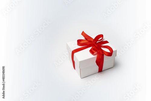 Obraz premium Top view of a white gift box with a red bow on a white background. Banner with copy space