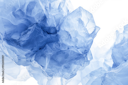 © agrus_aiart, Fototapeta premium Top view of abstract blue aerogel structure resembling frozen smoke isolated on white background