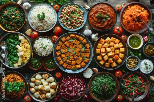 Fototapeta premium Top view of an assorted traditional Indian feast with vibrant dishes, perfect...