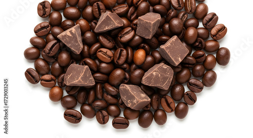 © aziz, Naklejka premium Top view of aromatic roasted coffee beans mixed with delicious dark chocolate chunks on a clean white isolated background