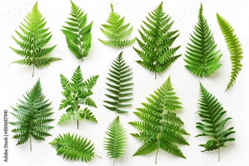 © watanu, Naklejka premium Top view of assorted fern leaves set isolated on white background, detailed and natural, perfect for botanical illustrations and green designs, no shadow, copy space