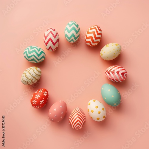 © Joyce, Fototapeta premium Top view of beautiful Easter eggs in a circle on table