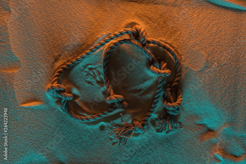 Naklejka premium top view of bend rope with knots on sand with orange and blue lights