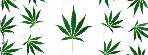 Fototapeta premium Top view of cannabis marihuana green leaves isolated on white background. Hemp leaf. Alternative treatment. Banner.