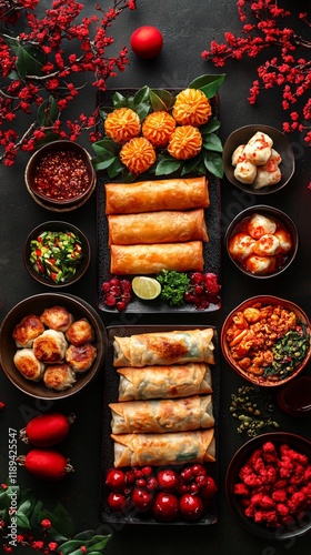 © Iryna, Fototapeta premium Top view of Chinese new year festival table