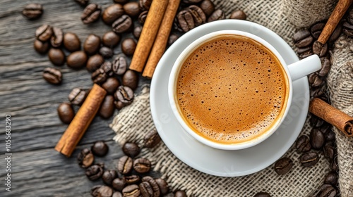 © 96, Fototapeta premium Top view of coffee and saucer on a wooden background, with blank space for text