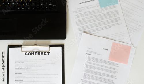 © Nastassia, Obraz premium Top view of contract in clipboard lying at office on table with laptop and documents