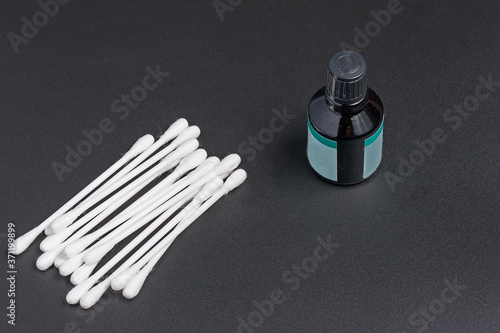 © vladimir subbotin, Naklejka premium Top view of cotton swabs and a bottle of antiseptic on a black background close up