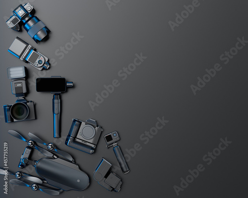 Naklejka premium Top view of designer workspace and photography gear on black table background