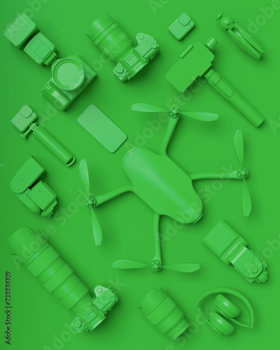 Naklejka premium Top view of designer workspace and photography gear on monochrome table