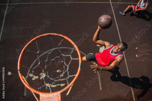 © LIGHTFIELD STUDIOS, Fototapeta premium Top view of excited african american man with basketball ball jumping near hoop