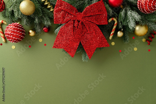 © photoguns, Naklejka premium Top view of festive Christmas border with lush fir tree branches, glittering red bow, golden and red baubles, and candy canes on an elegant, rustic green background. Xmas holiday backdrop.