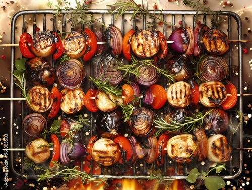 © Chirawan, Naklejka premium Top view of fresh herb grilled vegetables with barbecue sauce on grill being grilled. Delicious freshly made food.
