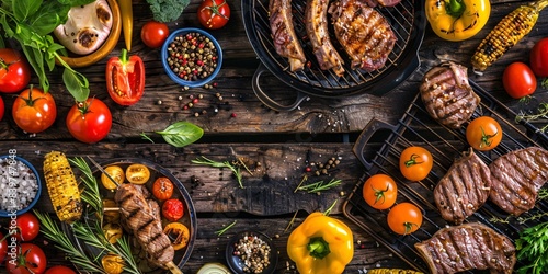 Fototapeta premium Top view of fresh meat and vegetables on grill