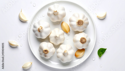 © Hyejin Kang, Fototapeta premium Top view of garlic on a white plate and background. Healthy ingredients garlic.