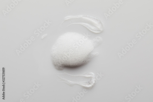 Fototapeta premium Top view of gel brushstrokes with soap foam on grey background