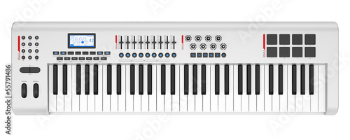 © Tiler84, Naklejka premium top view of gray synthesizer isolated on white background