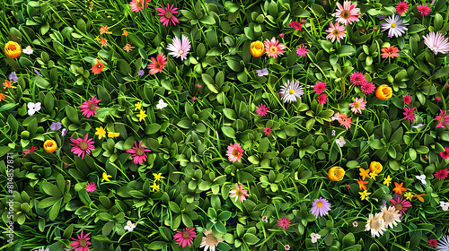 Fototapeta premium Top view of green grass with flowers. seamless background, top view,