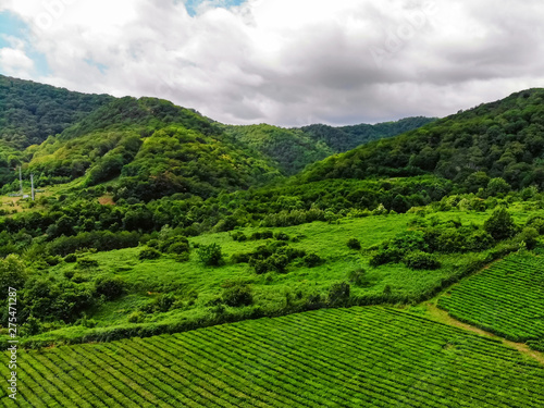 © Yakov, Fototapeta premium Top view of green tea plantation taken by drone camera at cloudy weather