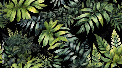 © SeanJVision, Fototapeta premium Top view of green watercolor tropical leaves background