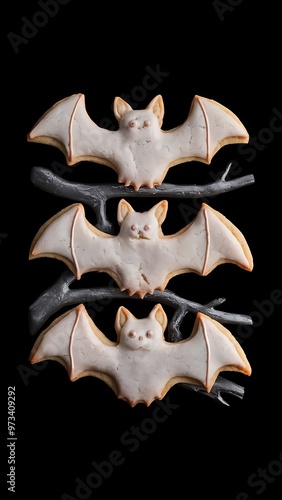 © Kartik, Fototapeta premium Top view of halloween bat cookies isolated on black background
