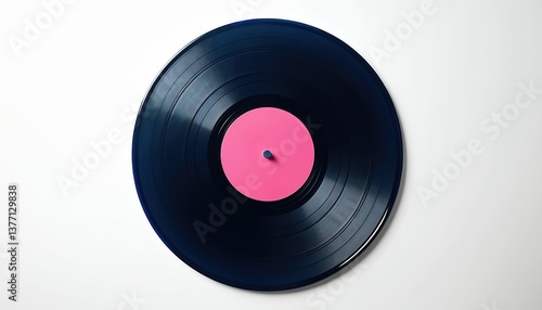 © miss irine, Fototapeta premium Top view of isolated vinyl record on white background. Black vinyl record with pink label, studio shot. Music media, classic musical album, retro record. Perfect for music tech, music albums.