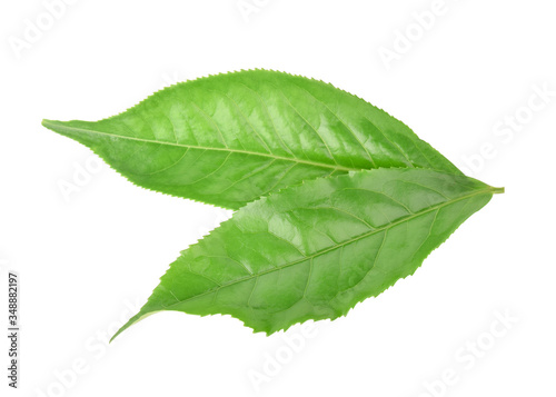 © Buratsakorn, Obraz premium Top view of leaves green tea isolated on white background.