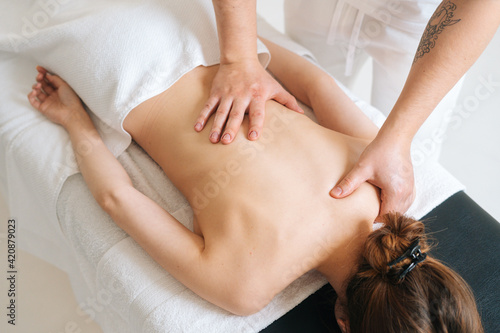 Fototapeta premium Top view of male masseur doing back massage to young unrecognizable woman in...