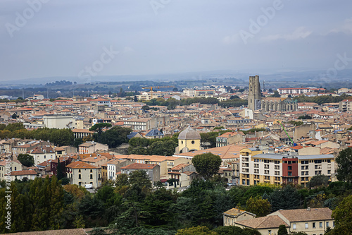© dbrnjhrj, Fototapeta premium Top view of medieval city of Carcassonne. Carcassonne, Aude Department, region of Occitanie, France.