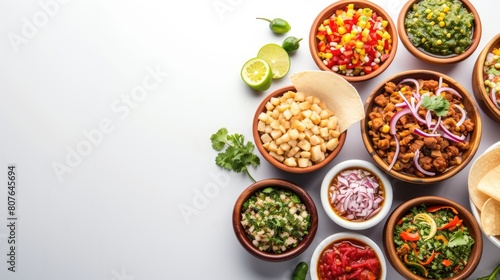Fototapeta premium Top View of Mexican Dish Assorted Fresh Salsas and Dips in Various Bowls.