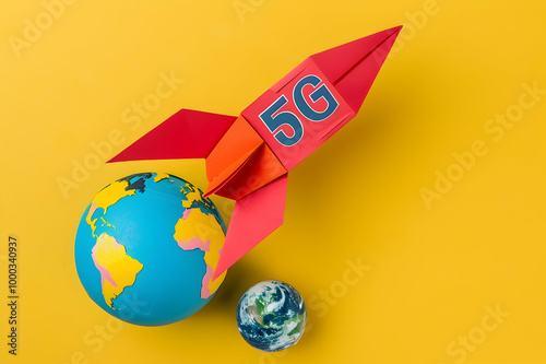 © Muzamilart, Fototapeta premium top view of paper rocket with 5g lettering near globe on yellow background