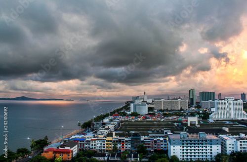 Obraz premium Top view of Pattaya town with the sea and build tower. Black cloud on sky