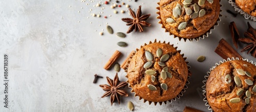 Fototapeta premium Top view of pumpkin muffins with spices and seeds on a light background offering copy space image to represent autumn Halloween and Thanksgiving baking ideas