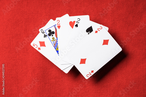 © LIGHTFIELD STUDIOS, Obraz premium top view of red poker table and playing cards combination with different suits